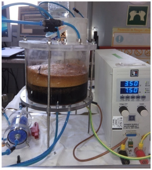 Figure 4 shows the single cavity electrolyzer without a membrane at the start of an electro-oxidation process, at a constant electrode voltage of 3.5 V, generating a current of 7.5 A. The electric current varies over time due to the electrolytic reactions.