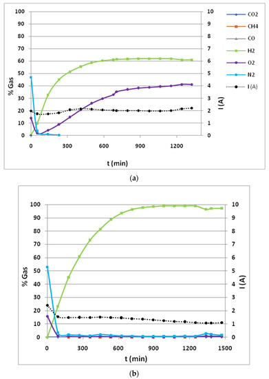 Hydrogen production from the alkaline electro-oxidation of biodiesel wastewater exhibited higher hydrogen production rates (%) than those generated from the olive mill wastewater. Hydrogen production reached a percentage of 98%, close to that obtained in the alkaline electrolysis assisted by pure glycerol. The electrolytic process was performed with a 100 cm2 surface area and electrodes having a thickness of 8 and 16 mm, at a constant voltage of 3 V (Figure 8a,b, respectively), to compare results. The results displayed in Figure 8b show that the generation of other gases was always less than 2%. At the beginning of the electrolysis, from minute 1 to 105, there were traces of air in the reactor, which were expelled by the pressure of the generated gas flow.