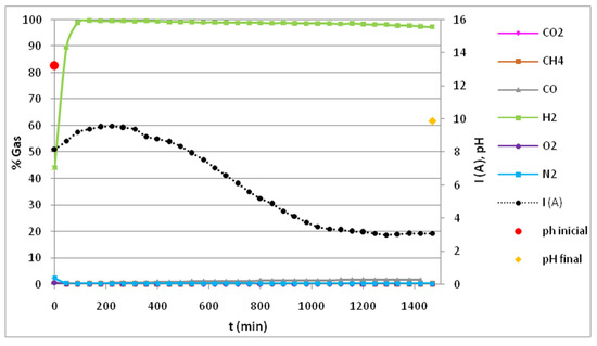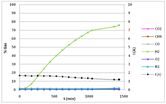 The temporal evolution of the percentages of generated gases in an electro-oxidation process over time is displayed in Figure 6. Hydrogen production increases over time, with a minimal generation of other gases throughout the 24 h period of the alkaline electrolytic process. The hydrogen percentage is below 76% of the global flow, while the total percentage of gas generated and measured by the chromatograph is less than 80%. The remaining 20% of the flow gas is argon, which is not measured by the chromatograph, as it is the carrier gas. Thus, it can be considered that the purity of the generated gases is high, since the argon is not generated by the electro-oxidation process. The low values displayed by the electric current of 1–2 A indicates a low gas flow. The flow of generated gases at the beginning was 1.54 L/h and at the end of the process was 0.52 L/h.