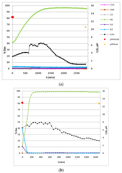In terms of gas flow generation, 1.54 L/h and 0.55 L/h were measured at the start and end of the process (Figure 8a), while Figure 8b shows a higher flow rate was produced during the whole process, with a flow of 2.83 L/h at the beginning and 1.40 L/h at the end. This behavior is reflected in the swiftness with which high hydrogen production (%) is reached. The low production of other gases points to a total oxidation of the biodiesel wastewater.