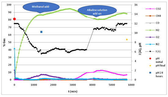 The second addition was an alkaline solution 20 M KOH, at minute 4094, as hydrogen production was decreasing and carbon dioxide increasing, indicating partial oxidation of methanol. Carbon dioxide increased from minute 3024, reaching a maximum of 12.56% at minute 4500, and then dropped slightly. A high percentage of hydrogen was produced throughout the process, with a minimum generation of other undesired gases. The most interesting aspect of this alkaline electro-oxidation process is the high flow of gases generated, which was 5.94 L/h at the beginning and 5.27 L/h at the end.