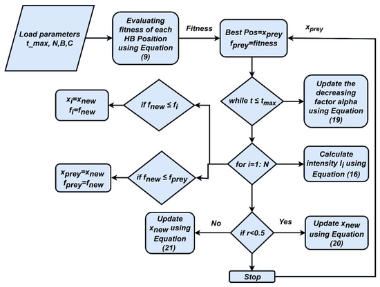 where is the new position of the honey badger and is the target’s location. The honey badger changes its position by following Equation (21). As this involves both the exploration and the exploitation phases, it performs a global search. Figure 2 explains the working of the HBA algorithm in detail.