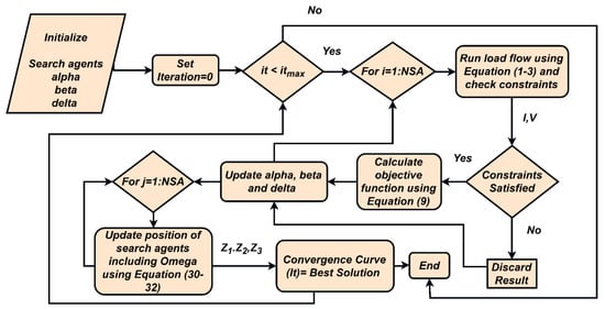 where represents the current iteration, is the position vector of the grey wolf and is the position vector of prey. The behavior of the encircling of the wolves around their prey is represented by Equations (22) and (23). The ω update their position by Equation (24). Figure 3 displays the execution procedure of the GWO algorithm.