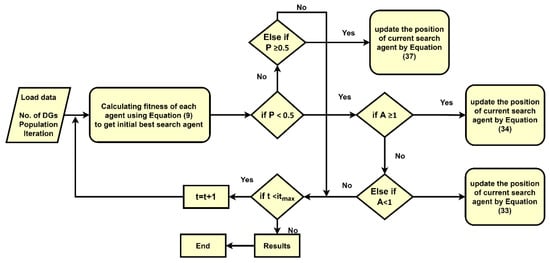 In this attacking method, a spiral Equation (37) is used to imitate the movement of whales in a helix shape. There exists a probability () of 50% to work between both the attack strategies using the bubble net method. During the exploration, to find prey, the search agent’s location is chosen randomly rather than opting for the best agent, and this enables the WOA algorithm to work towards a global search solution. Figure 4 depicts the functioning of the WOA algorithm.