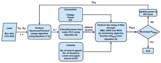 Three metaheuristic optimization algorithms HBA, GWO and WOA are applied on IEEE 33-bus and 69-bus radial distribution systems to optimally size where the PLI index is used for the suitable placement of DGs. For this objective, an optimization method is defined in MATLAB to minimize the power loss of the system as shown in Figure 5. In the initial step of the optimization procedure, the line and bus data are loaded giving us the active power demand () and the reactive power demand () of the buses with the reactance () and resistance () of the line. In addition to this, a backward/forward sweep load flow analysis is performed on an IEEE 33-bus distribution system which calculates the bus voltages and branch currents. The optimal locations of the DGs are calculated through the PLI method by using Equation (6). These optimal locations, with the combination of constraints and initialized variables shown in Figure 5, are inserted into the optimization algorithms to perform the optimal sizing of DGs. Initially, the DG value is randomly chosen within the bounds of the constraints mentioned in Equations (12)–(14). This DG is inserted into the suitable location provided by the PLI method and the power losses of the system are computed using the objective function in Equation (9). If the power losses are minimized, the system returns a DG value which is an optimal size to allocate in the system. Otherwise, the DG value is updated, and the process of load flow analysis is performed again repeating the cycle until the value is minimized or the iteration criteria are met.