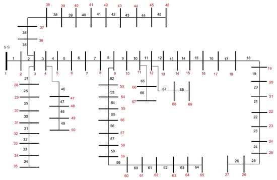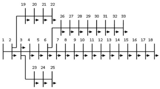 IEEE 33-bus and 69-bus radial distribution systems are shown in Figure 6 and Figure 7. The voltage constraints of the systems are between 0.95 (p.u) and 1.05 (p.u).