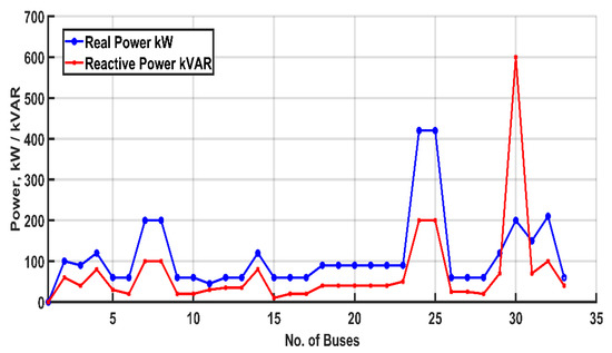 Real and reactive power variations of 33-bus distribution system without DG placement.