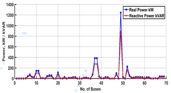 Real and reactive power variations of 69-bus distribution system without DG placement.