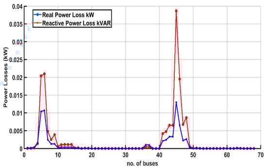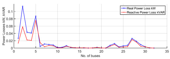 Real and reactive power loss variation of 69-bus distribution system without any DG placement.