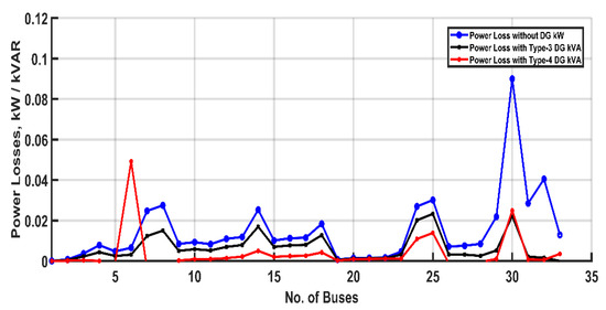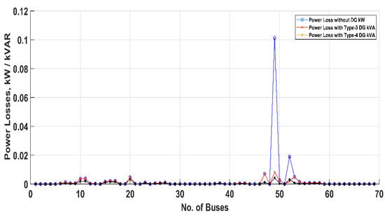 The contribution of the active and reactive power of a bus is dependent on the load profile of a bus. For an IEEE 33-bus system, the reactive power demand at bus 30 in Figure 8 reaches up to 600 kVAR and the active power demand is negligible, whereas for an IEEE 69-bus system at bus 50, the active and reactive power reaches 1250 kW and 900 kVAR in Figure 9. The active power losses (kW) in 33-bus and 69-bus systems without the allocation of DGs in the system are seen in Figure 10 and Figure 11 showing that the highest power loss is 0.11 kW at the 2nd bus and 0.013 kW at the 45th bus. After allocation of DG type-1 and type-3 at 0.9 and unity power factor, respectively, active and reactive power losses are detailed in Figure 12 and Figure 13. The maximum losses are 0.09 kW with the allocation of DG type-1 and minimum with the placement of type-3 DG at 0.9 pf lagging. Without the optimal allocation of any DG, the balance of power is not evenly distributed and there is room for improvement in the system. This challenge is resolved by either an even distribution of the load profile or by inserting optimal DGs into the system. The voltage variations per unit across 33-bus and 69-bus distribution power systems are represented in Figure 14 and Figure 15. It is observed that few buses have a voltage less than 0.95 (p.u) because of the power losses at these buses. These power losses may occur because of the impedance of the overall system or copper losses due to more current withdrawn by the buses as they have heavy loads attached to them.