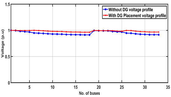 Voltage profile variation (p.u) of 33-bus distribution system before and after DG placement.