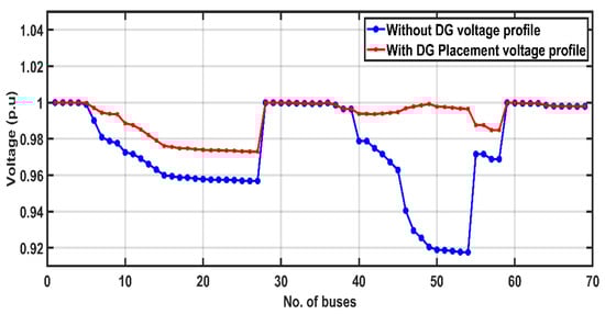 Voltage profile variation (p.u) of 69-bus distribution system before and after DG placement.