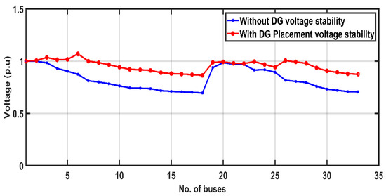 Voltage stability variation (p.u) of 33-bus distribution system before and after DG placement.
