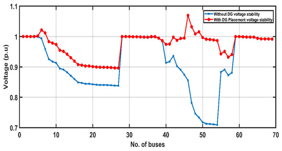 Voltage stability variation (p.u) of 69-bus distribution system before and after DG placement.