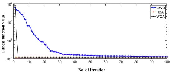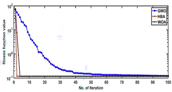 DG sizing is executed by applying three metaheuristic optimization algorithms. These algorithms converge in a specific time period depending upon the complexity, size of the problem and the searching ability of these algorithms. Almost every optimization algorithm tries to achieve the global best solution in a short time span to avoid divergence at any point. In Figure 18 and Figure 19, it is noticed that HBA took one and two iterations for IEEE 33-bus and 69-bus, respectively, to achieve the optimum and accurate results, far faster than WOA which converged in three iterations. GWO achieved its best possible solution in a higher number of iterations. The convergence curves of the implimented optimization algorithms are as follows: