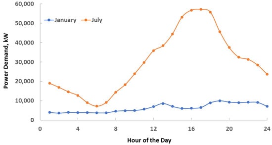 The community under consideration consists of 10,000 houses and is located near the Dallas–Fort Worth (DFW) metroplex, an area rich in both solar and wind resources. At a latitude of 31.54 degrees, the average insolation in the area is 198 W/m2. Excellent wind resources with average wind velocities of 12 m/s exist within a radius of 150 km from this urban area. However, the electricity demand of the homes in this area is significant, especially during the summer. Figure 1 shows the simulated electric power demand of these homes during two days of the year, in January and July. The effect of air-conditioning on the power demand during the summer days is apparent in this Figure.