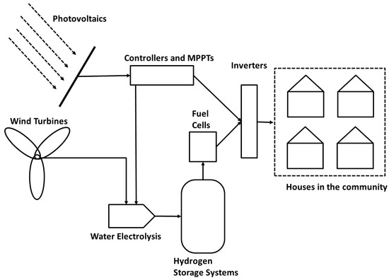 It is axiomatic that the electric power demand of the simulated community must be matched by the supply, which is derived from photovoltaic (PV) systems and wind turbines. Since the two RES are not dispatchable, energy storage systems are also needed to supply the community during the hours of low electric power generation. The schematic diagram of the proposed electric power system is shown in Figure 2, where the arrows denote the flow of electric power. Electricity is generated by an array of wind turbines and several solar farms with PV cells. Given the generated noise, the wind turbines may not be located very close to the community, but rather within a radius of 150 km. The performance of the PV systems is enhanced by maximum power point trackers (MPPT) and controllers ensure the optimum generation of solar power. Since the homes use alternating current (ac), voltage inverters convert the direct current (dc) generated in the PV cells—as well as in the fuel cells –to alternating current (ac). The instantaneously generated electric power is fed to the buildings to supply all or part of the hourly demand. When the generated power is higher than the demand, electrolytic systems utilize the excess energy and generate hydrogen, which is stored in hydrogen tanks for future use. When demand exceeds the supply, the deficit is provided by the stored hydrogen in fuel cells (direct energy conversion).