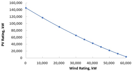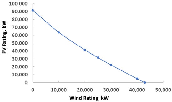 This is called “case A” and Figure 3 shows the necessary wind and solar power ratings that would make this community grid independent and reliant on RES. Since there are two energy sources, a suitable combination of the two will be used for this purpose. It is observed in the Figure that the addition of approximately 43 MW of wind power alone, or of 92 MW of PV power alone, or a combination of the two sources, as shown in the Figure, will ensure the continuous supply of the electric power needs in the community by the available RES.