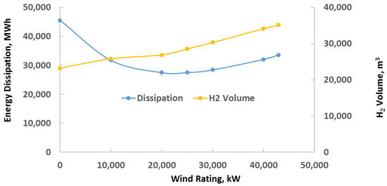 The exact combination of wind and solar units will very likely be determined by cost considerations, which will include the additional renewable capacity as well as the annual energy dissipation and the necessary storage infrastructure. Figure 4 depicts the annual energy dissipation due to the storage–regeneration process in MWh (left axis) and the necessary energy storage in m3 of hydrogen (right axis). It must be noted that the stored chemical energy in 1 m3 of H2 at ambient temperature and 50 MPa is approximately equal to 3.6 × 109 J (1 MWh).