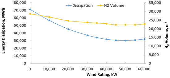 A comparison of Figure 4 and Figure 6 shows that the dissipation in this case is approximately 12% higher in case B than in case A. However, the required hydrogen energy storage at the minimum dissipation is approximately 17% less in case B. This is due to the fact that wind generates a much higher fraction of the energy in case B and wind turbines in this region have significantly higher power operating factors (POFs) than solar PV installations (36.4% and 18.5%, respectively). The higher POF of the wind turbines ensures a lower energy storage requirement.
