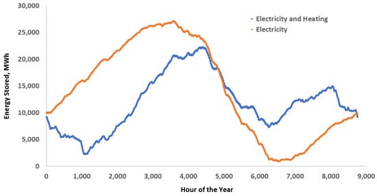 Hourly hydrogen energy storage needed in the two cases examined. Hour 1 corresponds to the first hour of the year (midnight to 1 a.m. on 1 January).