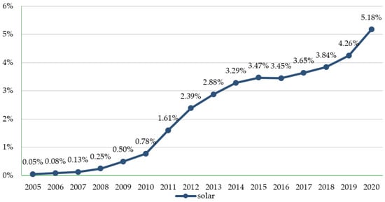 Share of solar energy in structure of electricity production in EU in the period 2005–2020. Based on data from [77].