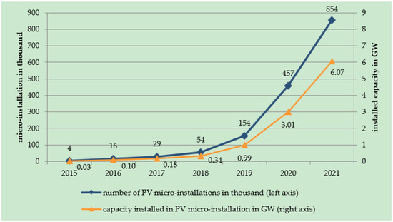 At the end of 2021, there were 854,000 PV micro-installations (<50 kW) in Poland, and the total installed capacity exceeded 6 GW (Figure 2).
