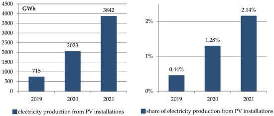 Production of electricity from PV installation and share of PV sources in electricity production in Poland in 2019–2021. Based on data from [79,80].