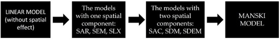 In this study, spatial econometrics models were used due to the spatial nature of the research. According to the current paradigm of spatial econometrics [81], we can observe autocorrelation as the lag of the dependent variable, the lag of the independent variables, or the spatial lag of the error. The currently valid classification of spatial econometric models was developed by Elhorst [82] and was adopted by the scientific community as an estimation standard. Figure 4 shows the type of spatial econometric models.