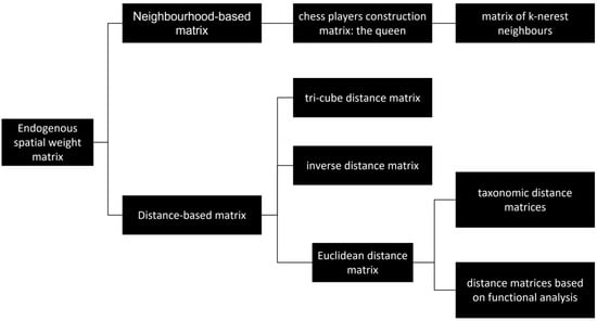 On the other hand, the method of data representation and the research problem to be solved compile the form and structure of the weight matrix. Therefore, the issue related to the construction of the weight matrix is the approach to the complicated system of objects and choosing the method of representation of alternative relationships. All activities lead to the best reproduction of reality in spatial research. How significant the problem is to determining the weights matrix can be proved by many works [83,84,85,86,87] and others. Figure 5 presents a list of different types of weight matrices [88]. Pietrzykowski conducted extensive research on this problem, which resulted in a proposal to modify the spatial weight matrix, thanks to which the data can be described in a more detailed way [89] as well as increasing the possibilities of spatial analyses by using functional analysis [87].