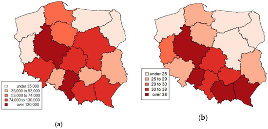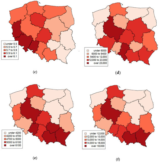 Figure 6 and Figure 7 show the spatial distributions of individual variables included in the analysis. The variables are presented on the administrative map of Poland at the NUTS-2 level (i.e., at the regional level). Figure 6 contains the variables that describe photovoltaic installations in terms of power and the number of installations in individual regions. In Poland, the development of photovoltaic installations occurs in its southern part due to the power and number.