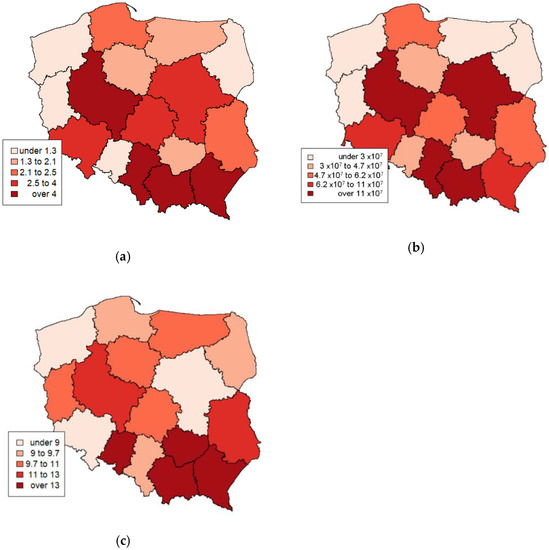 Spatial distribution of economic variables. (a) Salary in thousand PLN. (b) Total subsidies to micro PV systems in PLN. (c) Number of PV installations per 100 million GDP in the region.