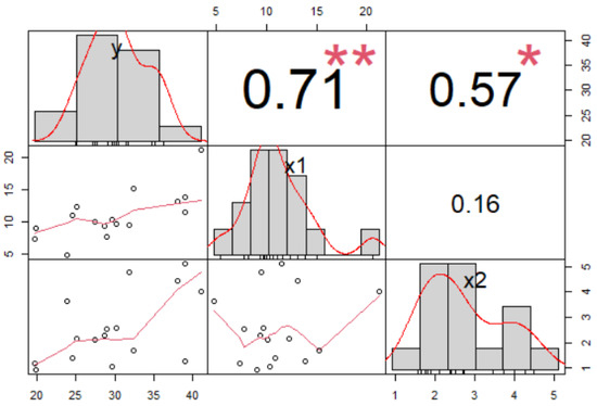 Pearson’s correlation coefficients and histograms for the research variables. y: ‘power capacity in watts per person’; x1: ‘number of PV installations per 100 million GDP’; x2: ‘salary in thousand PLN’; correlation coefficients are at the intersection of columns and rows; *, ** denote the 5% and 1% significance levels, respectively.