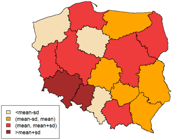 The voivodships with the most significant number of PV installations are those with the largest population, i.e., Mazowieckie, Wielkopolskie and Śląskie (in Poland, regional administrative units are historically called voivodships, so the region and the voivodship mean the same in this work). Table 1 lists essential variables characterizing each region at the end of 2020. These variables have proven to be potentially significant in explaining the increase in the number of PV installations and the interregional impact.