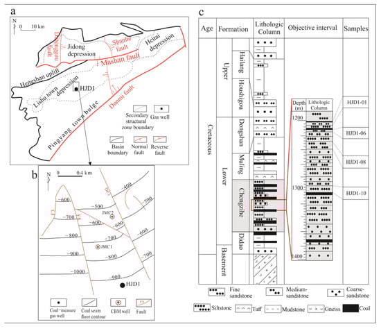 Geological background of the study area: (a) Location of Coal-measure Gas Well HJD1 in Jixi Basin; (b) geological structure of the area where Well HJD1 is located; (c) sampling stratigraphic column in Well HJD1.