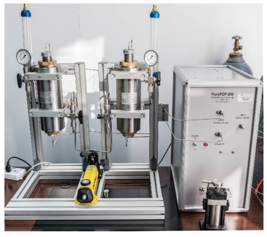 The permeability was tested by a Pulse Decay Permeameter-PDP-200 (American Core Lab Company, Tulsa, OK, USA, Figure 2), which was based on the pulse transient method. The permeability could be obtained based on the pressure decay curve. Practices for Core Analysis (SY/T5336-2006) was the reference method for this experiment, and the test gas was nitrogen. Permeability experiments were conducted by increasing the confining pressure and fixed pore pressure. This simulates the increasing effective stress during the coal-measure gas development.