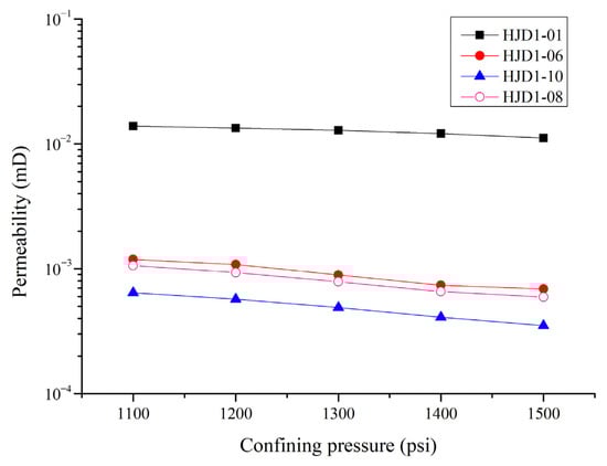 The permeability and confining pressure are negatively correlated. The permeability gradually decreases as the confining pressure increases for the medium sandstone, the fine sandstone, and the siltstone (Figure 4). The decrease in permeability for HJD1-01, HJD1-06, HJD1-08, and HJD1-10 while the confining pressure increased from 1100 to 1500 psi was 2.75 × 10−3 mD, 0.499 × 10−3 mD, 0.466 × 10−3 mD, and 0.292 × 10−3 mD, respectively.