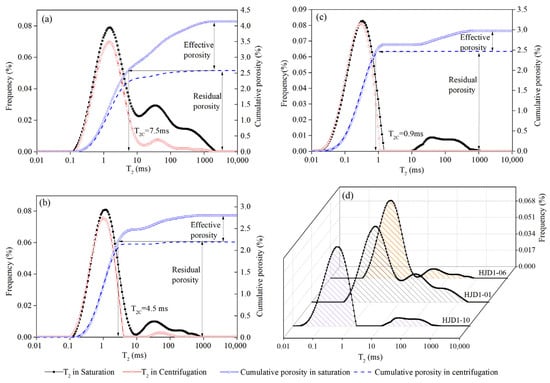 The pore size distribution, total porosity, effective porosity, and the T2C value could be obtained by the T2 spectrum [1,14,46]. The T2 spectra of the sampling sandstones under the water-saturated condition and the centrifugal condition is shown in Figure 5a–c. T2 spectra for three sandstones range from 0.01 to 1889.65 ms. T2 spectra of HJD1-01, HJD1-06, and HJD1-10 show a wide bimodal distribution with a main peak and a subpeak. There is a significant difference in T2 distribution between the three sandstones (Figure 5d). The main peak of HJD10 is separate from the subpeak; however, the main peak of HJD1-01 and HJD1-06 is interconnected with the subpeak. The main peaks of HJD1-01, HJD1-06, and HJD1-10 are within 0.13–11.09 ms, 0.13–9.66 ms, and 0.01–1.38 ms. The subpeaks of HJD1-01, HJD1-06, and HJD1-010 are within 11.09–1889.65 ms, 9.66–666.99 ms, and 12.75–622.25 ms.