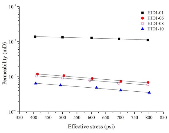 The grain size of sandstone has a significant impact on sandstone permeability [51]. The permeability decreases in the order of medium sandstone, fine sandstone, and siltstone under similar effective stress. For the medium sandstone (HJD1-01), the fine sandstone (HJD1-06), and the siltstone (HJD1-10), the slope in Figure 6 is −6.95 × 10−6, −1.39 × 10−6, and −0.75 × 10−6, respectively, as the effective stress increases from nearly 400 psi to 800 psi.