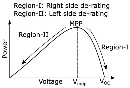 Due to the reasons mentioned in Section 1, active power of the PV system is controlled in our proposed method to regulate the feeder voltages at the end of the line. The de-rating control method of PV systems is used here to control the active power of PVs at the dc/dc conversion stage. In de-rating control of PV systems, the operating point of PVs is not limited to only maximum power point (MPP); the PVs can be operated above or below MPP to control the flow of active power. Figure 2 depicts the de-rating regions on the power versus voltage (P–V) curve of PVs. The region on the left side of MPP has a wider control area as compared to right side, however, in this region the rate of change of active power (ΔP) with system voltage (ΔV) is low. Therefore, the right side region is selected in our method because of convenience of high ratio. For precise control of ΔP with ΔV, the left side region is more suitable.