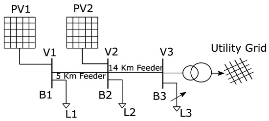 The proposed control was implemented on a LV distribution system as shown in the Figure 3. Three buses (, , and ) are considered in the system with corresponding voltages (, , and , respectively). The system is connected to the utility grid using a step-up transformer. Two PV generators are considered in the system which are connected to bus and . Load is a variable load whereas loads and are the fixed load in the system. Normally the overvoltage problem arises at the end of the line, therefore, voltage is controlled by varying the active power generation of PV generators. The detailed rating and values of the parameters are given in the Appendix A of the paper.