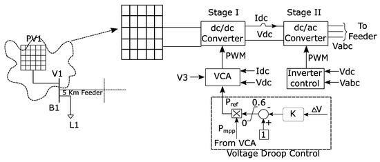 The de-rating technique of PVs is a well-used technique; a neural network based reserve generation algorithm was used in [31] for de-rating the PVs, and a Newton-quadratic interpolation algorithm was used in [32,33]. A PI controller for de-rating method was used in [34], and a fuzzy logic controller based de-rating scheme was discussed in [35,36,37]. However, in these techniques the PV system is de-rated with the aim to achieve frequency regulation capabilities, whereas in our proposed control de-rating is used to compensate the overvoltage at the line end. The feeder voltages are sensed and de-rating control is coordinated with the sensed voltages. For example, if the voltages on bus 2 of Figure 1 are above the rated value, the PV voltages are pushed above the maximum power point voltages to control the flow of active power in the distribution system. The detailed control is discussed in Section 3 of the paper.