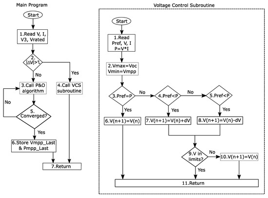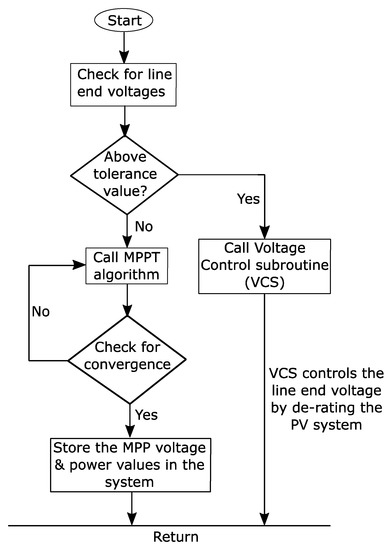 A detailed insight of the control is shown in Figure 4. A two-stage control is adopted for the PV system, wherein a step-up chopper is used for stage-I and a three-phase dc to ac inverter is used in stage-II. A simple d-q transformation-based control is adopted for the generation of PWM of the three phase inverter. For dc/dc converter, the end-of-line voltages are continuously sensed to control the output power flow of PV generator. The de-rating based voltage control algorithm (VCA) is used here to increase or decrease the active power flow from the PVs. The flowchart of the proposed control is shown in Figure 5. The steps involved in the control technique are: (1) checking of the line end voltages for limits violation, (2) calling MPPT or voltage control subroutine (VCS), and (3) storing the MPP values for MPPT or controlling the line end voltages for VCS. The detailed algorithm is shown in Figure 6. The algorithm has two main parts: Main program and Voltage control subroutine (VCS). In the main program, the system rated voltages are compared with the voltages of bus 3: