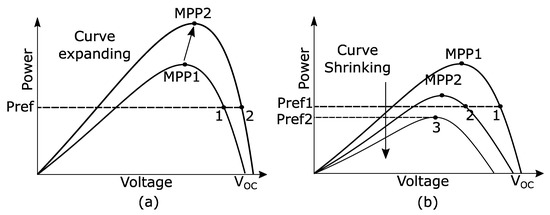 (a) Depiction of reference and maximum power points during the expansion of P–V curve. (b) Depiction of reference and maximum power points during the shrinking of P–V curve.