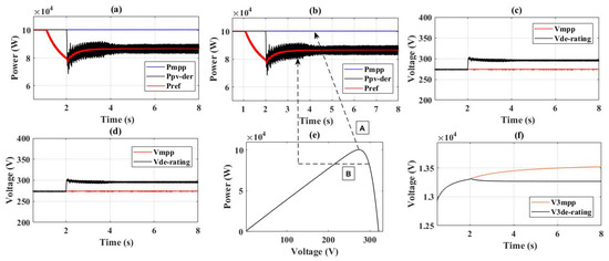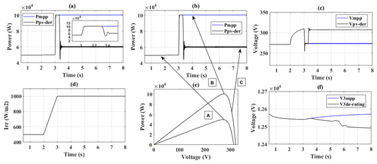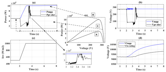 In this case the value of irradiance was increased from 500 W/m2 to 1000 W/m2 from t = 2 s to t = 3 s, respectively (Figure 9d), while the system load was kept constant. The simulation results for this case are depicted in Figure 9. With the increase in the irradiance from 500 to 1000 W/m2, the maximum available PV power increased from 48 kW to 100 kW (Figure 9a) and the operating point of PV shifted from “A” to “B” on the P–V curve (Figure 9e). Post irradiance change, for MPPT mode, the system operated on point “B” and the voltage started increasing, while for operation in de-rating based VCA mode, upon an increase in the voltage beyond a predetermined level, the system was de-rated with operation on point “C” on the P–V curve (Figure 9e). Due to this de-rating the voltage remained within the prescribed limit. A comparison of the waveform (RMS value) with PV system operation in MPPT and de-rating mode is shown in Figure 9f. The numerical data of this case simulation is given in Table 3.