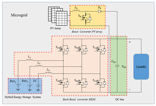 Each bidirectional converter consists of six bridged switches arranged as shown in Figure 1, three switching arms connect the MG DC Bus: the battery banks ( and ) and the through the filter inductors , and respectively. In addition, the boost converter is coupled in parallel to the DC bus, which is responsible for controlling the PV system.