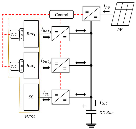 The architecture of the presented HESS in a DC MG consists of two battery banks with different characteristics ( and ) and supercapacitors (). A three-input bidirectional converter controls the charging and discharging of these energy storage elements in a coordinated manner.