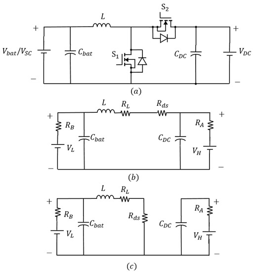 A single input bidirectional buck-boost converter was considered for modeling the HESS converter in the MG, using the average model equations for the batteries and SC reported in [27]. In this paper, the battery control system model is expanded for SC control, considering a simplified bidirectional converter with a single input, as shown in Figure 3, where represents the low voltage side (energy storage devices) and the high voltage side of the converter (DC bus).