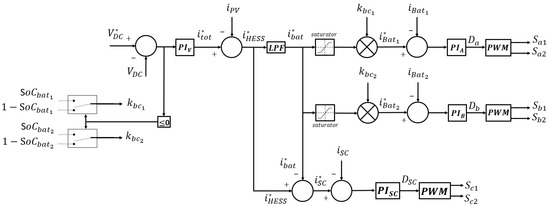 Figure 5 presents the complete control loop of the FBM-CSoC system that manages the batteries and SC energy flow. In this control strategy the error generated between the DC bus voltage and the reference voltage is used as a trigger for defining the batteries’ control gains () and (). The batteries’ control gains are multiplied by the battery reference current to give the reference current for the PI controllers for each battery technology. The SC reference current is obtained from Equation (13).