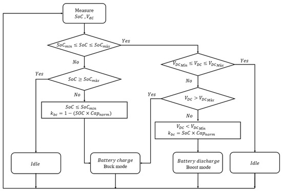 The flowchart in Figure 6 presents the battery-charge management strategy within the MG. Within the processes of charging and discharging the batteries, a parameter () is used in the control loop. This parameter integrates information from the batteries’ State of Charge () and nominal capacity ().